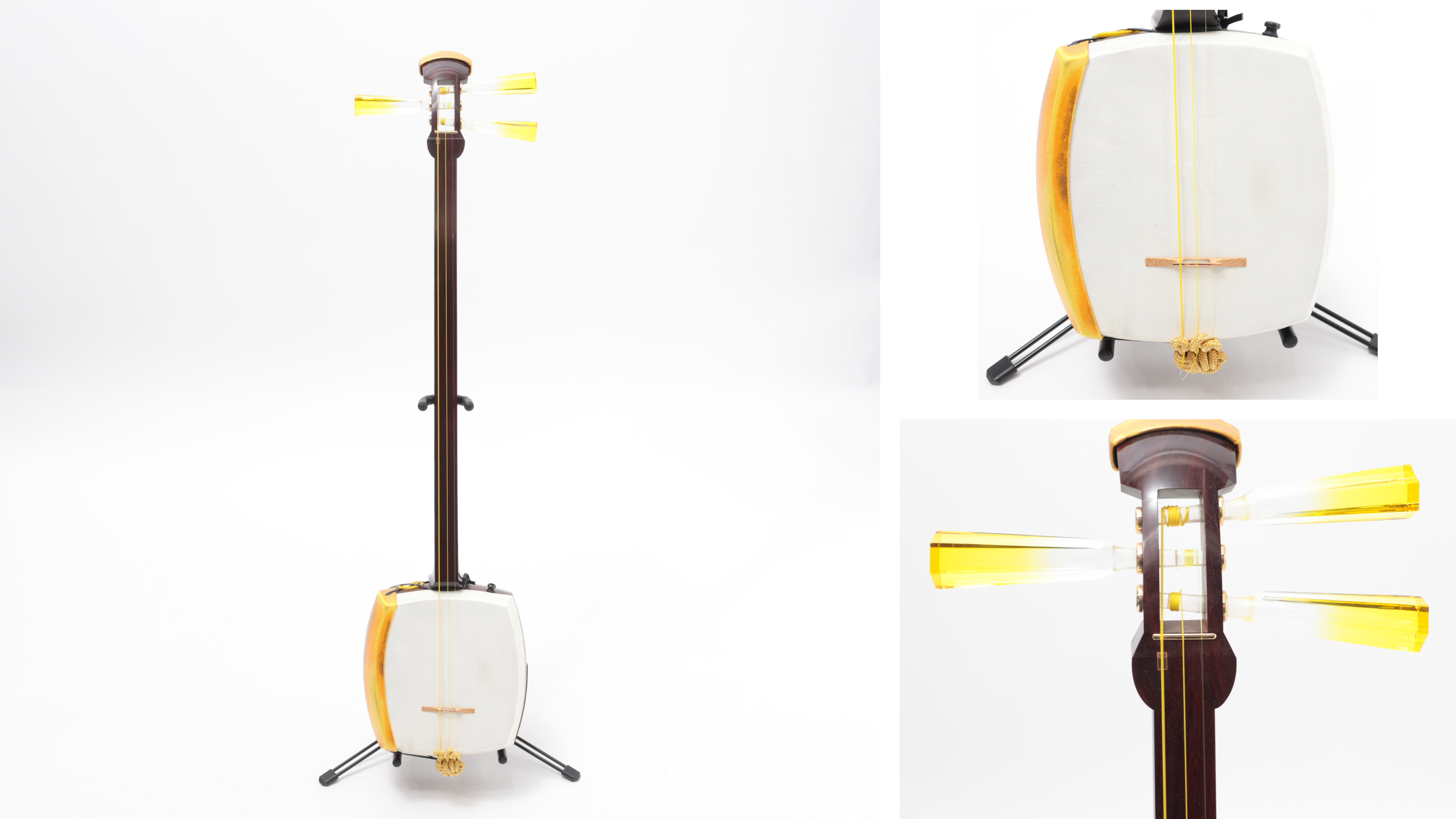 The two Tsugaru shamisen offered in this auction are especially meaningful instruments selected from the eight I used during WagakkiBand’s ten-year history. Both feature electric bodies and custom acrylic tuning pegs.
