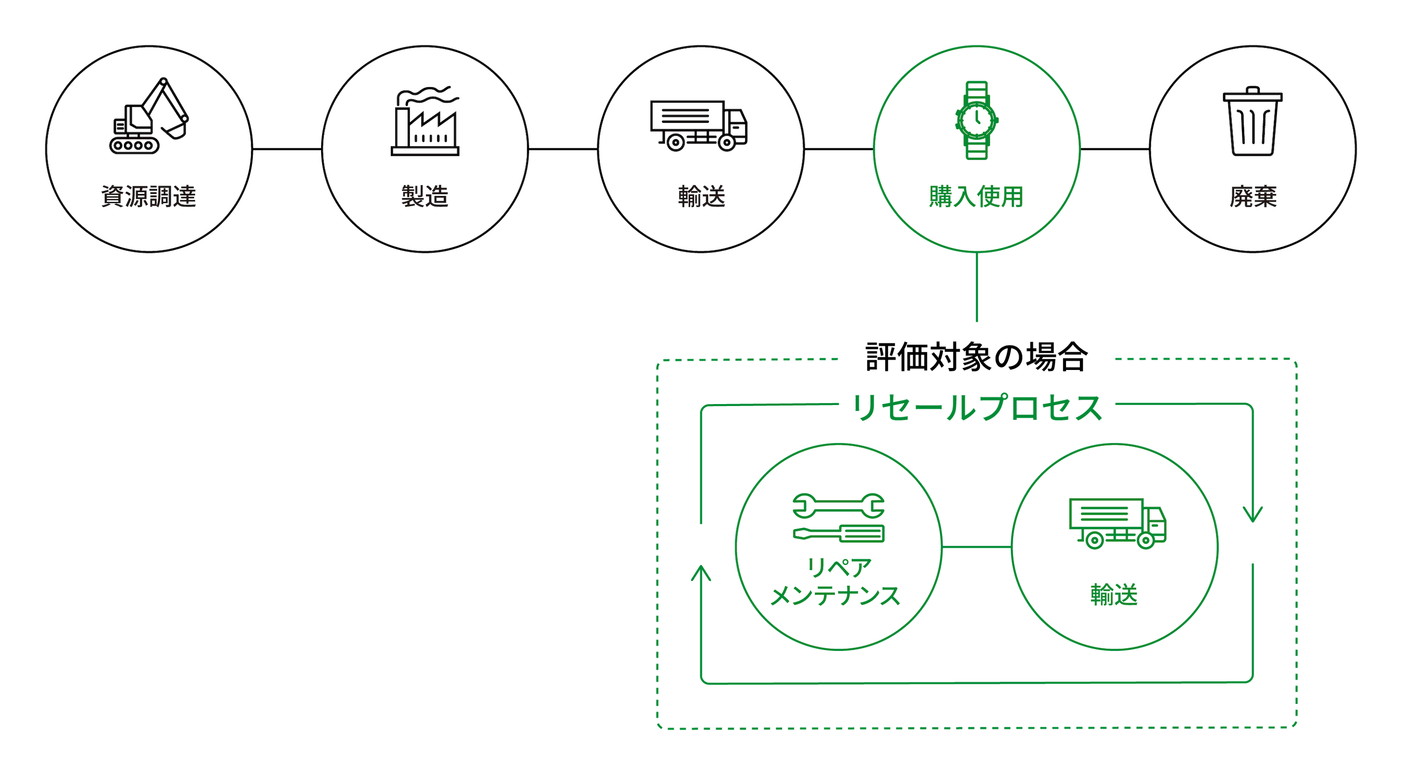 原材料調達・製造、流通、使用、廃棄までのフルライフサイクルを対象とし、評価対象の使用段階にはリセール工程(メンテナンス、リペア、再販に伴う輸送)を含めています。なお、店舗照明や建設、間接部門などに伴う間接的な負荷については、算定対象外(カットオフ)としています。